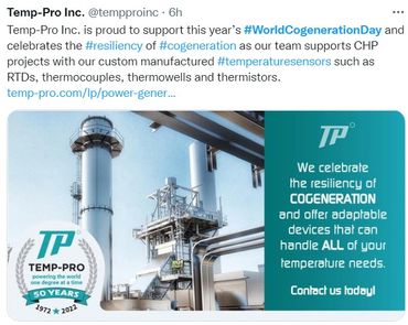 Temp-Pro Inc. is proud to support this year’s #WorldCogenerationDay and celebrates the #resiliency of #cogeneration as our team supports CHP projects with our custom manufactured #temperaturesensors such as RTDs, thermocouples, thermowells and thermistors.